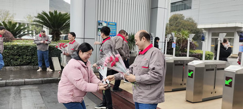 3月8日清晨,公司男領導們早早守候在公司一道門、二道門、南門入口處,為每一位上班的女職工送上嬌艷欲滴的鮮花和節日的祝福。一束束鮮花,一張張笑臉,構成了清晨最美麗的風景線。